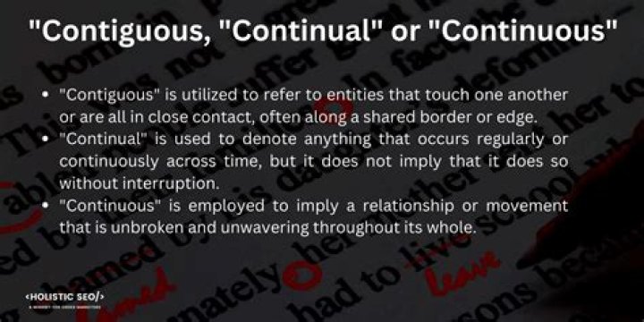 These two words have different meanings, so it's important not to mix up contiguous or continuous. Contiguous means touching or adjacent to. Continuous means uninterrupted and ceaseless.