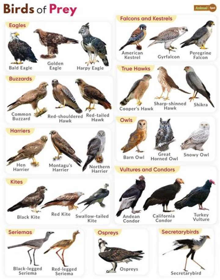 Birds of prey, also known as raptors, include species of bird that primarily hunt and feed on vertebrates that are large relative to the hunter.