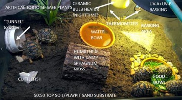 Tortoises love to dig and bury so a sand and soil mix is an excellent substrate. Hides, a water dish and other features such as wooden bridges and edible plants such as dandelions can be added to the enclosure. Tortoises do, however, have predators such as large birds, foxes and other pets.
