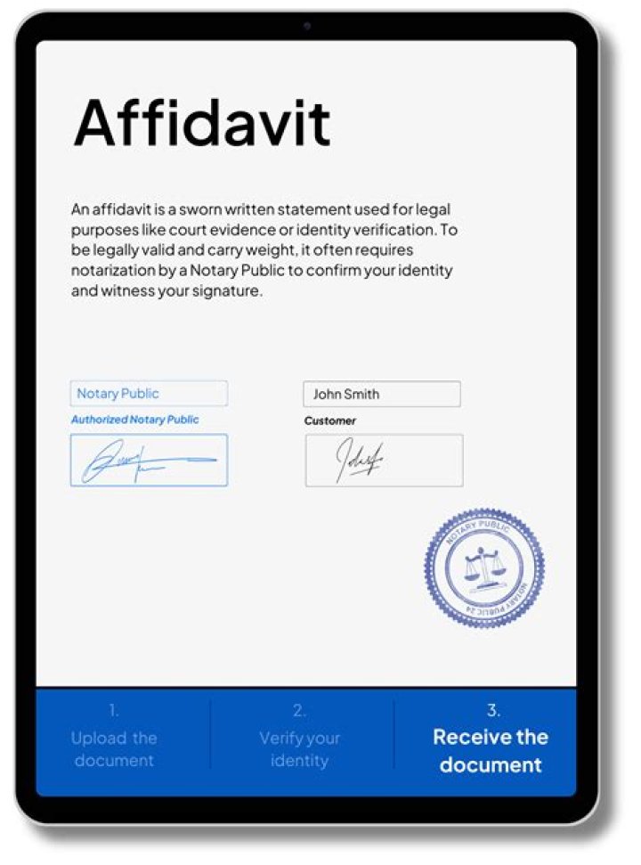 An affidavit is a document written statement filed by an affiant as evidence in court. In order to be admissible, affidavits must be notarized by a notary public. ... Once the affiant acknowledges signing the document for its intended purpose and signs the affidavit, the document is notarized and becomes a sworn affidavit.
