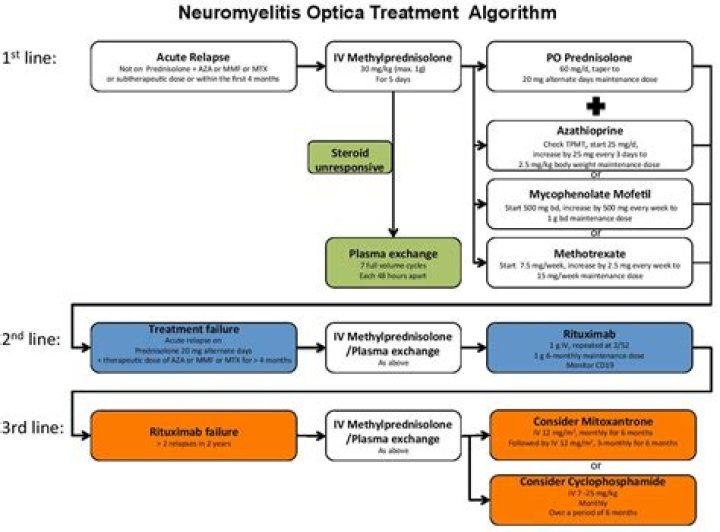 There's no cure for NMO, but treatments can help to ease symptoms, prevent future relapses and slows down the condition's progression. You may be prescribed: steroids to reduce the inflammation. medicine to suppress your immune system and ease your symptoms, such as azathioprine, mycophenolate or methotrexate.