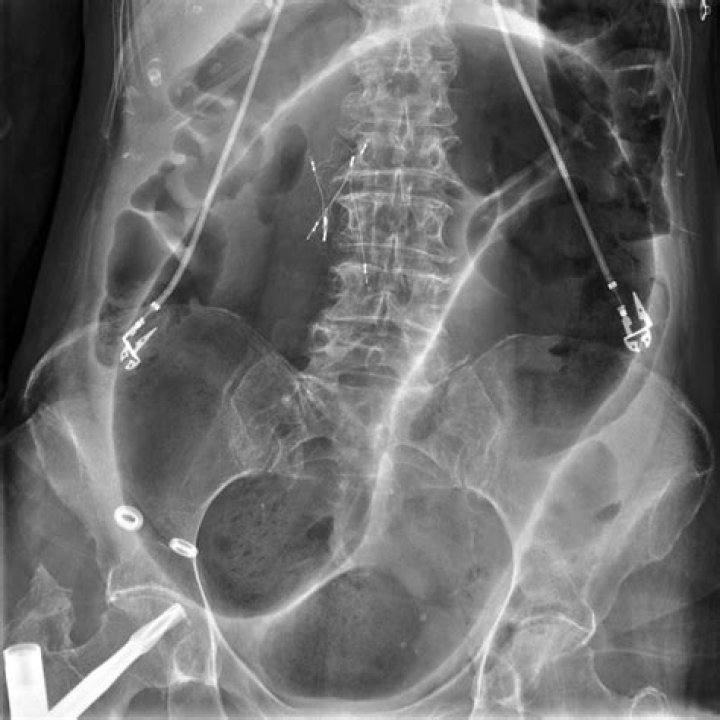 Plain abdominal radiographs are used as a screening tool for bowel obstruction but do not exclude this if they are normal. The main findings include dilated bowel loops (see 3-6-9 rule) with or without the presence of fluid levels. Erect chest radiographs can also be used to screen for complicating perforation.