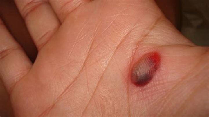 Blood blister: a blister full of blood due to a pinch, bruise or repeated friction. A blister is medically termed a vesicle. One that is more than 5 mm in diameter is called a bulla.