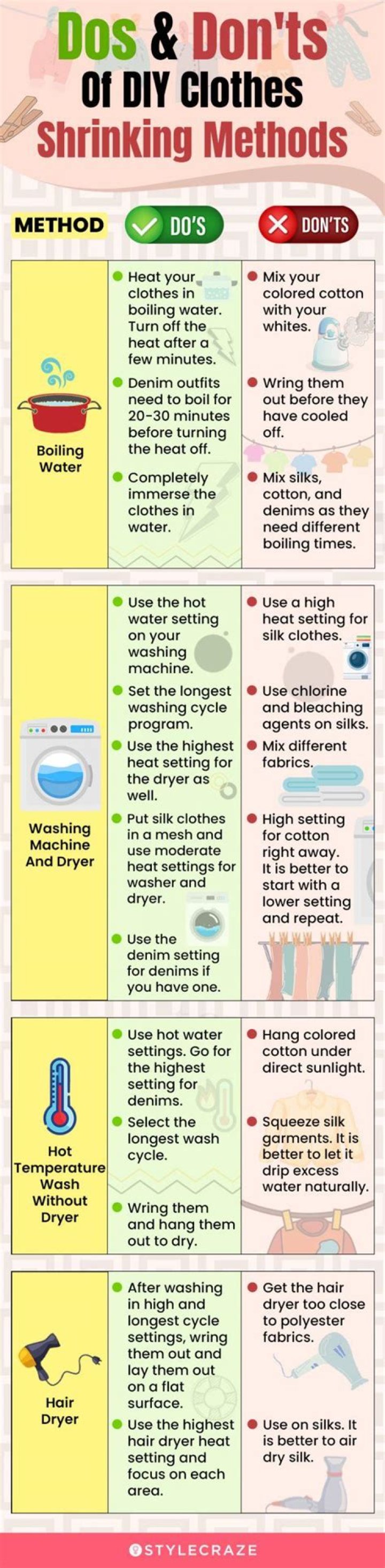 Clothes are much more likely to shrink when exposed to hot water or high dryer settings. ... Use delicate cycles instead, and put very delicate clothes in mesh laundry bags for increased protection. When it comes to drying, consider a “low heat” or “air dry” setting.
