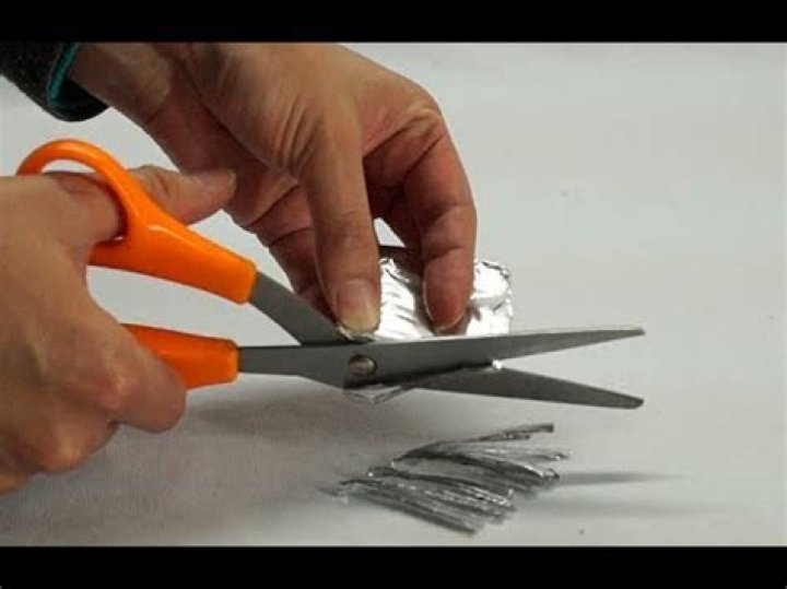 Take a piece of aluminum foil, about 8-10 inches long, and fold it lengthwise multiple times so you have a thick, folded strip of foil. The added layers of the aluminum foil will help sharpen the blades of the scissors multiple times with every cut of the foil.