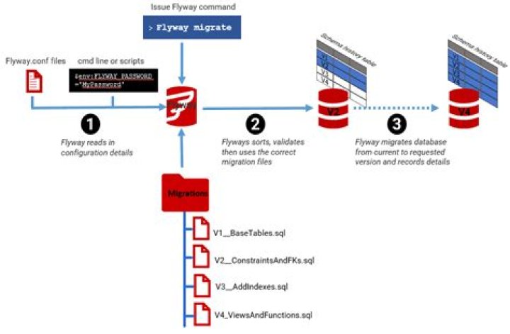 Flyway works by checking the current version of the database and by applying new migrations automatically before the rest of the application starts. ... Usually, this directory is classpath:db/migration , but one can change the default value if needed. Flyway's name convention consists of: Prefix: Defaults to V .
