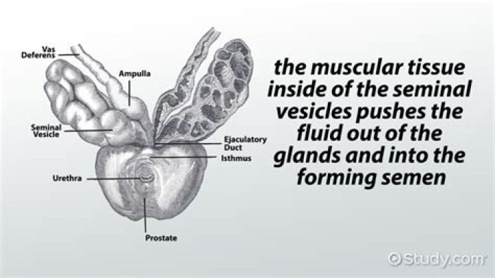 The fluid of the seminal vesicles makes up most of the volume of your ejaculatory fluid, or ejaculate. Prostate gland: The prostate gland is a walnut-sized structure that's located below the urinary bladder in front of the rectum. The prostate gland contributes additional fluid to the ejaculate.