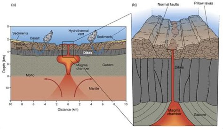 Dykes are perpetually formed as long as magma continues to flow through the plate boundary, creating a distinct, stratigraphic-like sequences of rocky columns within the seafloor. Ophiolites are formed when these sections of oceanic crust are revealed above sea level and embedded within coastal crust.