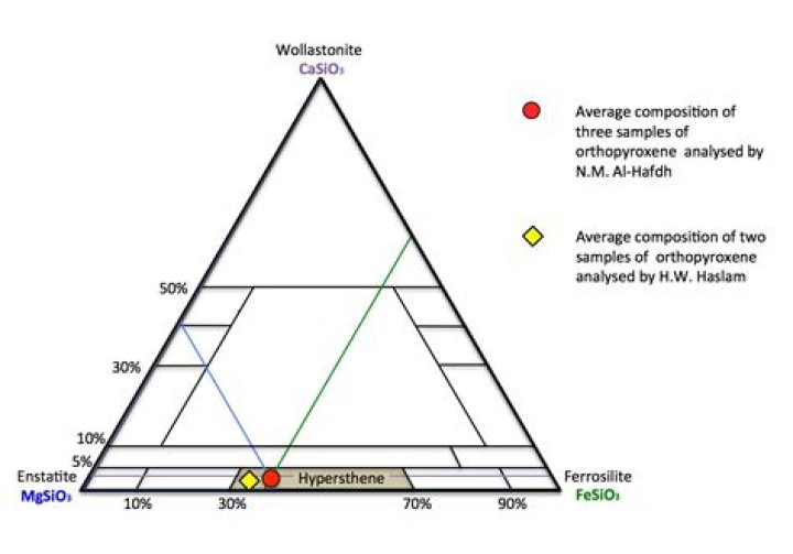 Orthopyroxene is a mixture of enstatite and ferrosilite components and is also called hypersthene. It is dark with a brownish tint in hand specimen and colourless to reddish under the microscope. Plagioclase is calcic and a labradorite composition is typical. The two minerals are present in mafic granulites.