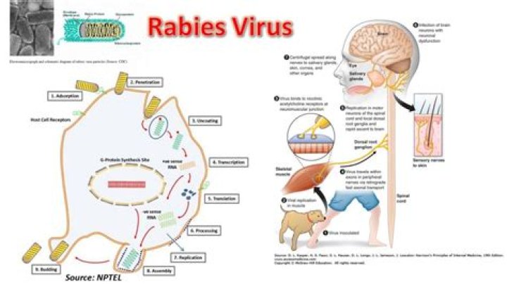 The virus is transmitted in the saliva of an infected animal. From the point of entry (usually a bite), the rabies virus travels along nerves to the spinal cord and then to the brain, where it multiplies. From there, it travels along other nerves to the salivary glands and into the saliva.