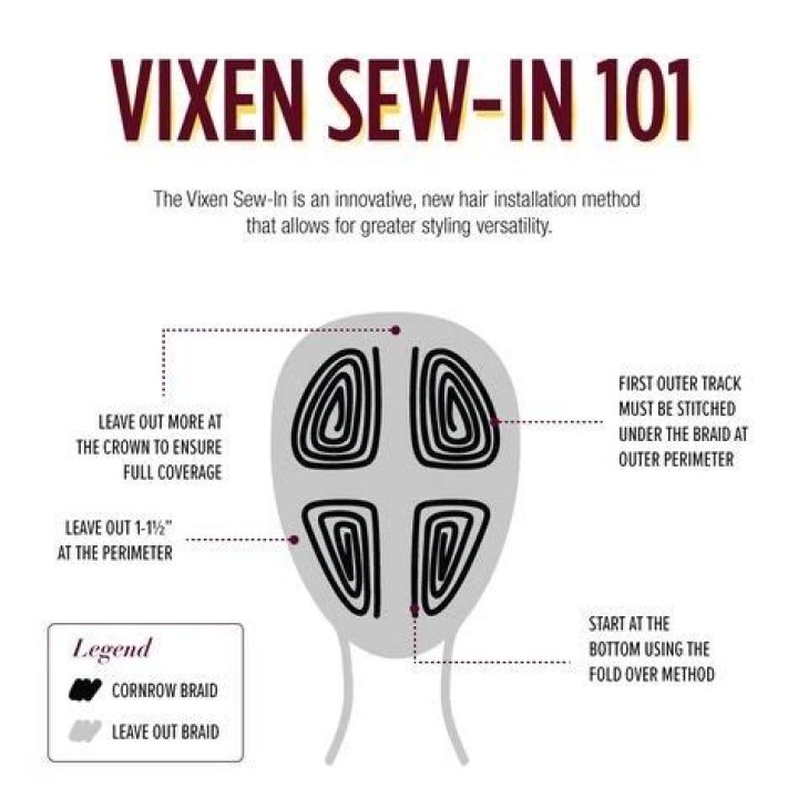 The Vixen sew-in is a newly popular weave installation method. This applies Hair Extension tracks in 4 different sections, rather than the traditional single “beehive” method. There is hair left out all around the edges, as well as in two parts cutting down the middle of your hair, and cutting across.