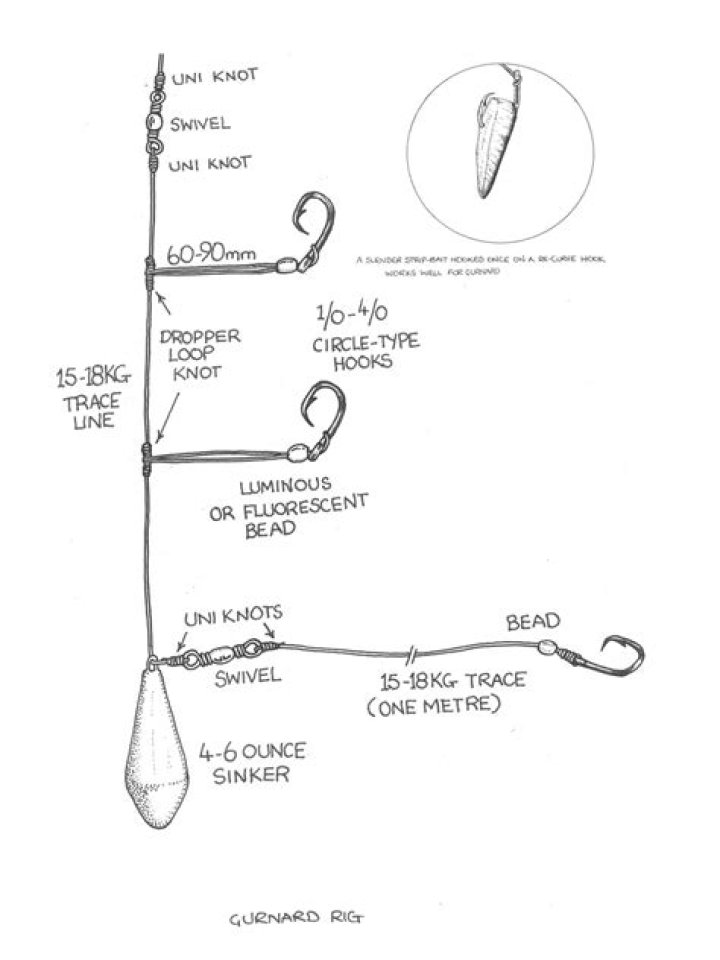 Gurnard can be targeted by using flasher rigs with small hooks (3/0 or 4/0) in brown or orange colours, baited with small chunks of squid, pilchard or bonito. Another good bait is salted mussels. Experienced fishermen will take a variety of bait as one type will often prove more popular on the day.