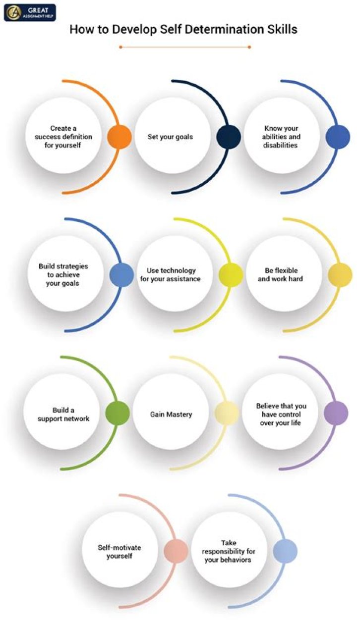 Self-determination involves many attitudes and abilities including: self-awareness, assertiveness, creativity, and pride, and problem solving and self-advocacy skills. To take charge of your own life, you must be able to set goals, evaluate options, make choices and then work to achieve your goals.