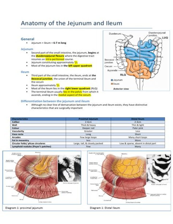 The jejunum is roughly 2.5 meters in length, contains plicae circulares (muscular flaps), and villi to absorb the products of digestion. The ileum is the final portion of the small intestine, measuring around 3 meters, and ends at the cecum.