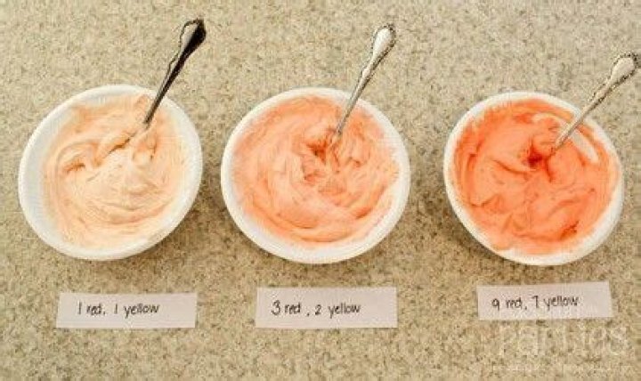 To get peach icing, the recommended ratio is one part red to three parts yellow. It's important that each part, or dab, of gel coloring you add is the same size for both colors.