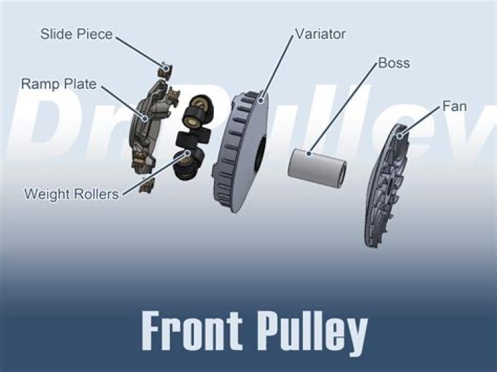 The driven pulley is so named because the driving pulley is turning it. Also referred to as the output pulley, it transfers energy to the driveshaft. A belt rides in a groove between two cones on each pulley.