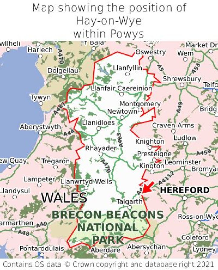 Hay-on-Wye, often abbreviated to just "Hay" is a small market town and community in the historic county of Brecknockshire in Wales, currently administered as part of the unitary authority of Powys.