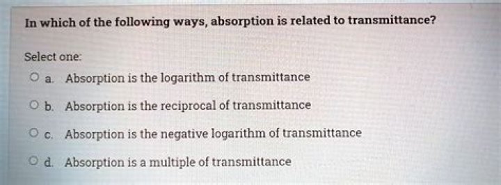 2. In which of the following ways, absorption is related to transmittance? Explanation: Transmittance is the ratio of the radiant power transmitted by a sample to the radiant power incident on the sample. Absorption is the negative logarithm of transmittance.