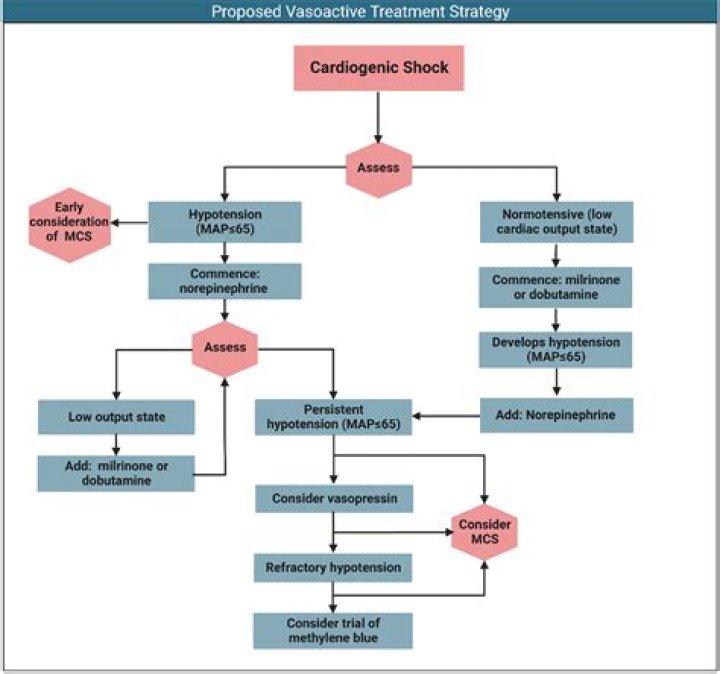 Medications to treat cardiogenic shock are given to increase your heart's pumping ability and reduce the risk of blood clots. Vasopressors. These medications are used to treat low blood pressure. They include dopamine, epinephrine (Adrenaline, Auvi-Q), norepinephrine (Levophed) and others.
