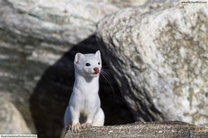 An ermine is dark brown in summer with a white belly, feet and a white line down its hind leg. It turns white in the winter. The least weasel has a reddish brown back, sides, tail and top of head with white underparts. It also turns white in the winter.