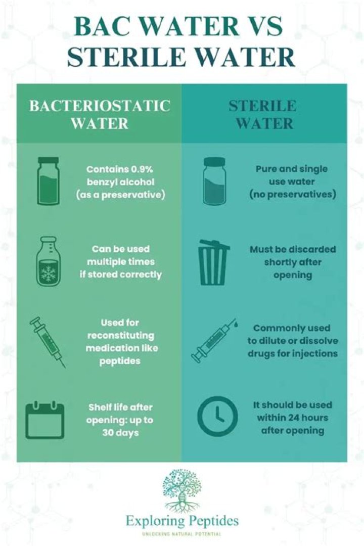 Bacteriostatic water is water with benzyl alcohol. Immediately you can gauge which is appropriate based on allergies. If you have an allergy to benzyl alcohol, discontinue or avoid bacteriostatic water and opt for sterile water. ... The absence of a bacteriostat in sterile water only allows for a one time use.