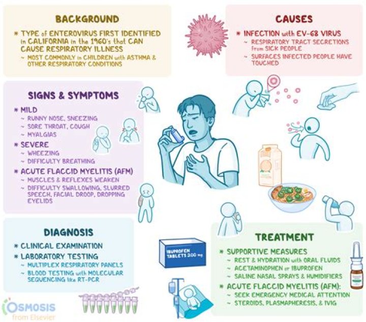 Enterovirus D68 is a virus that can make you feel like you have a cold. If it's severe, it could also make you wheeze or have trouble breathing, especially if you have asthma or other respiratory problems. Most cases are mild and last about a week, but if it's severe, you may need to go to the hospital.