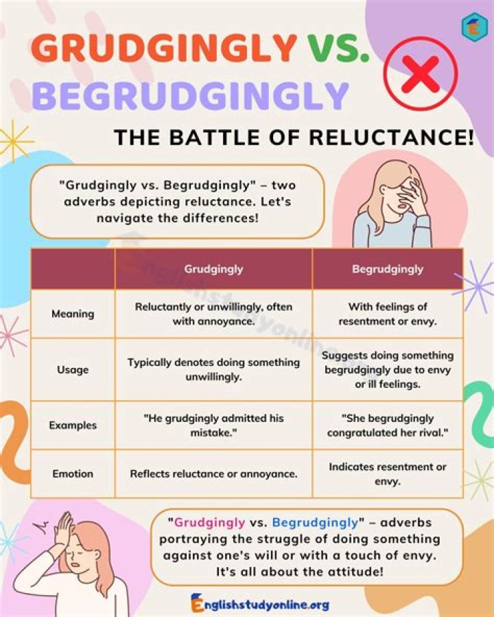 Grudgingly is when we show a lack of desire or resentment. Begrudgingly is a way to behave that is reluctant or envious.