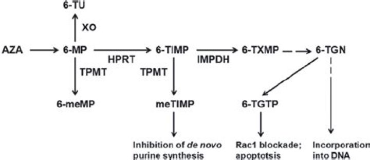 Metabolism of 6-mercaptopurine (6-MP) and azathioprine (AZA) is complex. Azathioprine is a prodrug that is non-enzymatically converted to 6-MP.