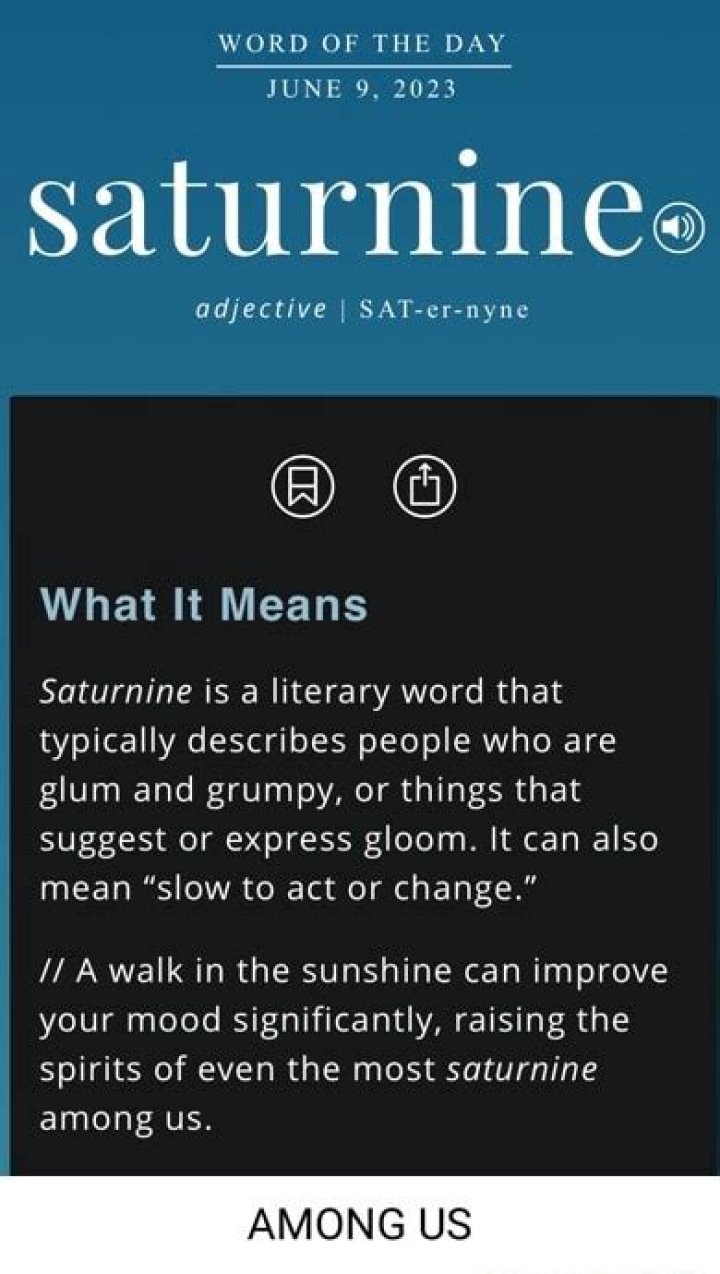 saturnine • \SAT-er-nyne\ • adjective. 1 : born under or influenced by the planet Saturn 2 a : cold and steady in mood : slow to act or change b : gloomy, surly c : sardonic.