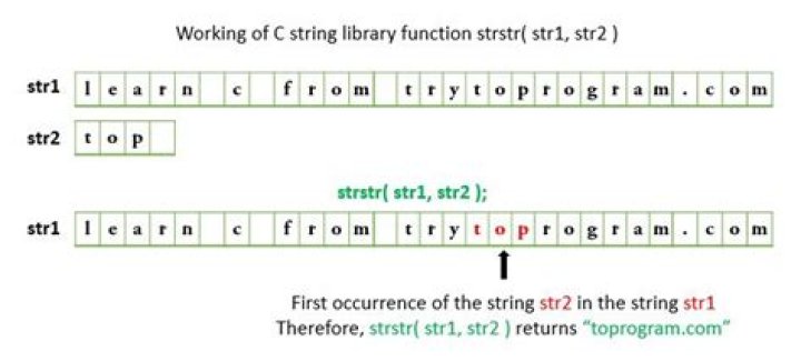 The strstr() function returns pointer to the first occurrence of the matched string in the given string. It is used to return substring from first match till the last character. Syntax: char *strstr(const char *string, const char *match)