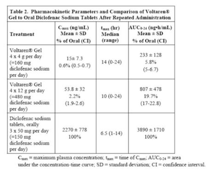 The amount of diclofenac sodium that is systemically absorbed from Voltaren® Gel is on average 6% of the systemic exposure from an oral form of diclofenac sodium.