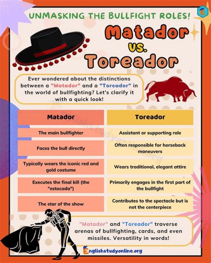 While in English the word matador is used to refer to any bullfighter, in Spanish a bullfighter is only a matador — which is Spanish for "killer" — once he actually kills the bull. Until then all bullfighters are known as toreros.