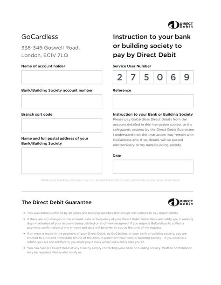 In order to fill in a Direct Debit mandate, customers require their name, bank name, sort code and account number. Once they have filled out their information, the mandate will need to be sent to Bacs, who will then transfer it onto the banks.