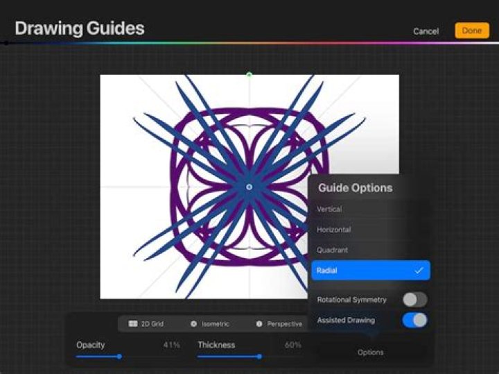 Procreate's Drawing Guides now include four different modes: 2D Grid, Isometric, Perspective, and Symmetry. ... If you choose Perspective mode, just tap to create up to three vanishing points. When using the Perspective Guide, you can create one, two, or three vanishing points by tapping.