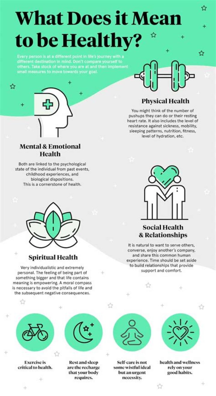 Health is "a state of complete physical, mental, and social well-being and not merely the absence of disease" according to the World Health Organization (WHO). Physical is about the body.