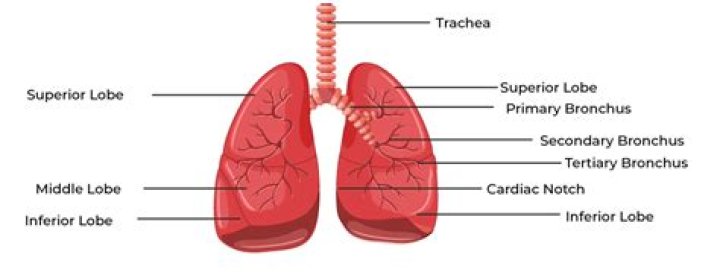 The right lung has 3 sections called lobes and is a little larger than the left lung, which has 2 lobes. The bronchial tubes divide into smaller air passages called bronchi, and then into bronchioles.