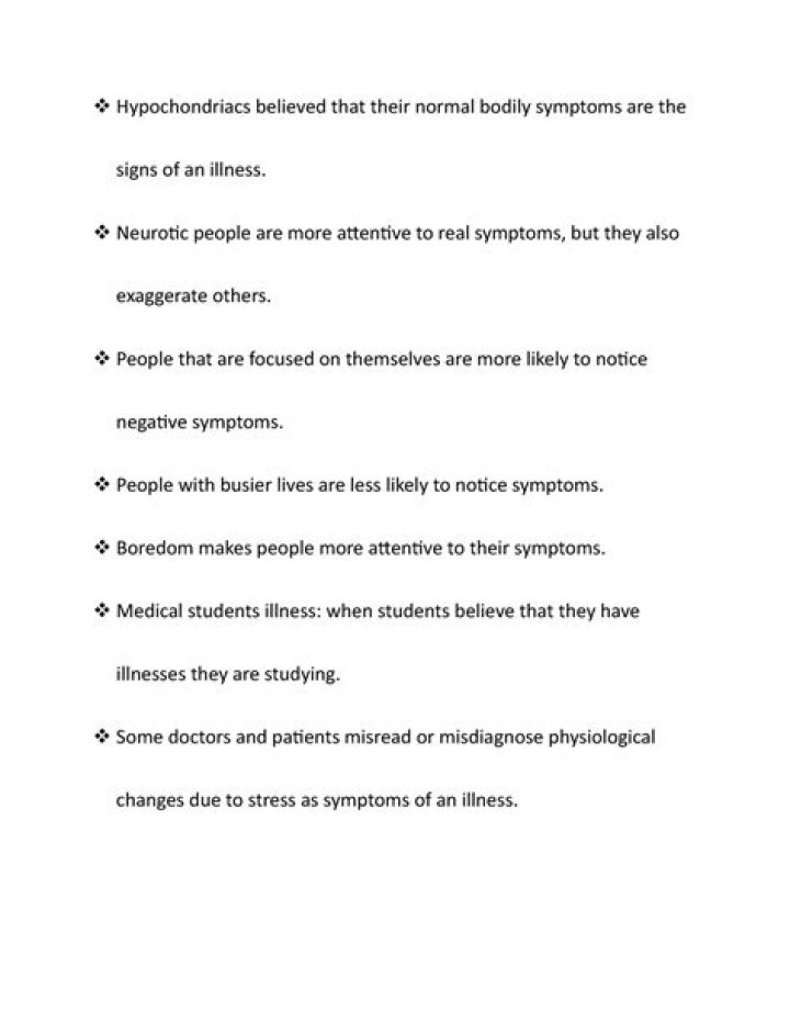 - Worrying that minor symptoms or body sensations mean you have a serious illness.