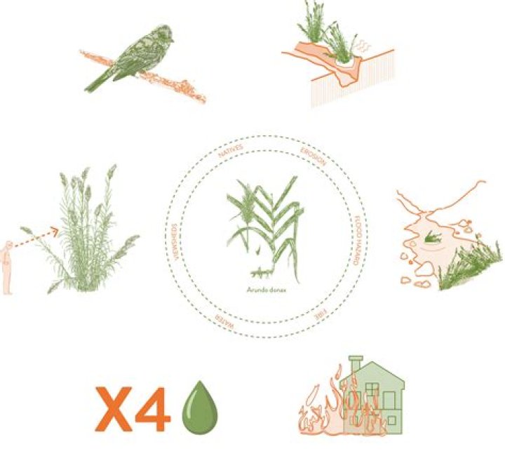Arundo donax was introduced from the Mediterranean to California in the 1820s for roofing material and erosion control in drainage canals in the Los Angeles area (Bell 1997; Mackenzie 2004). ... For example, it damages California's riparian ecosystems by outcompeting native species, such as willows, for water.