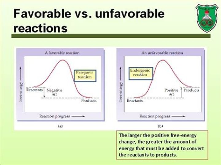 A favorable, or exergonic, reaction is one in which the energy state of reactants is higher than that of the products (∆G<0). ... An unfavorable, or endergonic, reaction is the one in which the energy state of the products is higher than that of the reactants (∆G>0).