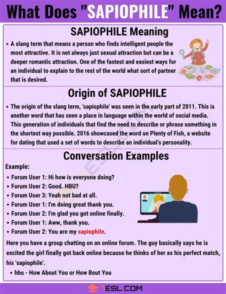 The sapiophile is the marked sexual tendency towards individuals that present/ display high indices of intelligence. ... The main difference is that while the sapiosexual can create effective bonds with that intelligent person.