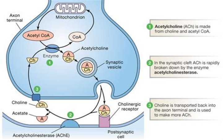 An enzyme called acetylcholinesterase breaks down acetylcholine. Some drugs that are used to treat myasthenia gravis act on acetylcholinesterase to stop the breakdown of acetylcholine. These acetylcholinesterase inhibitors increase the amount of acetylcholine available and so help muscle activation and contraction.