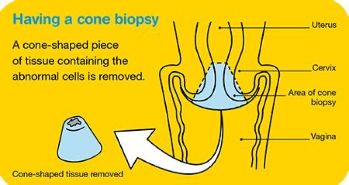 A cone biopsy is a small operation to remove a cone shaped piece of tissue from your cervix. You usually have it under general anaesthetic, which means you are asleep. The operation takes about 15 minutes.