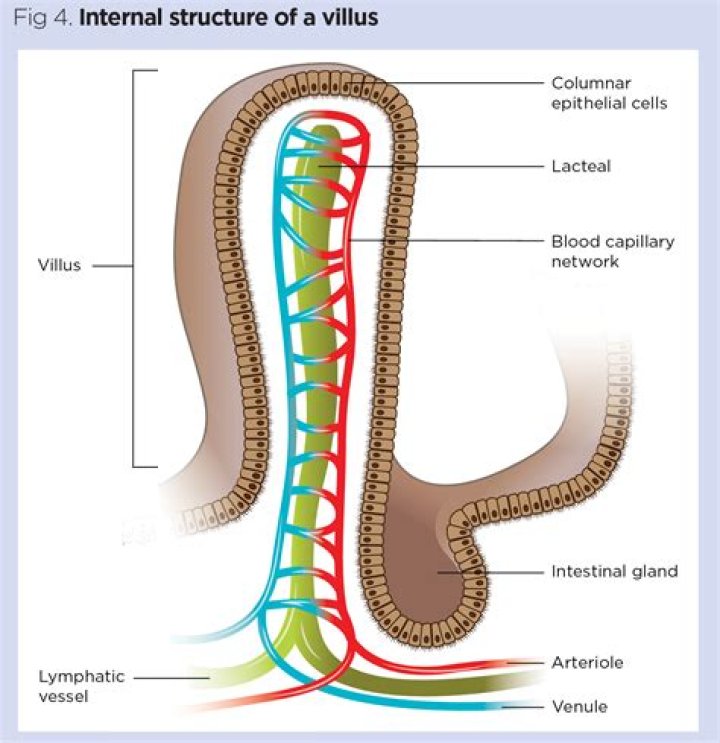 Villi contain capillary beds, as well as lymphatic vessels called lacteals. Fatty acids absorbed from broken-down chyme pass into the lacteals. Other absorbed nutrients enter the bloodstream through the capillary beds and are taken directly to the liver, via the hepatic vein, for processing.