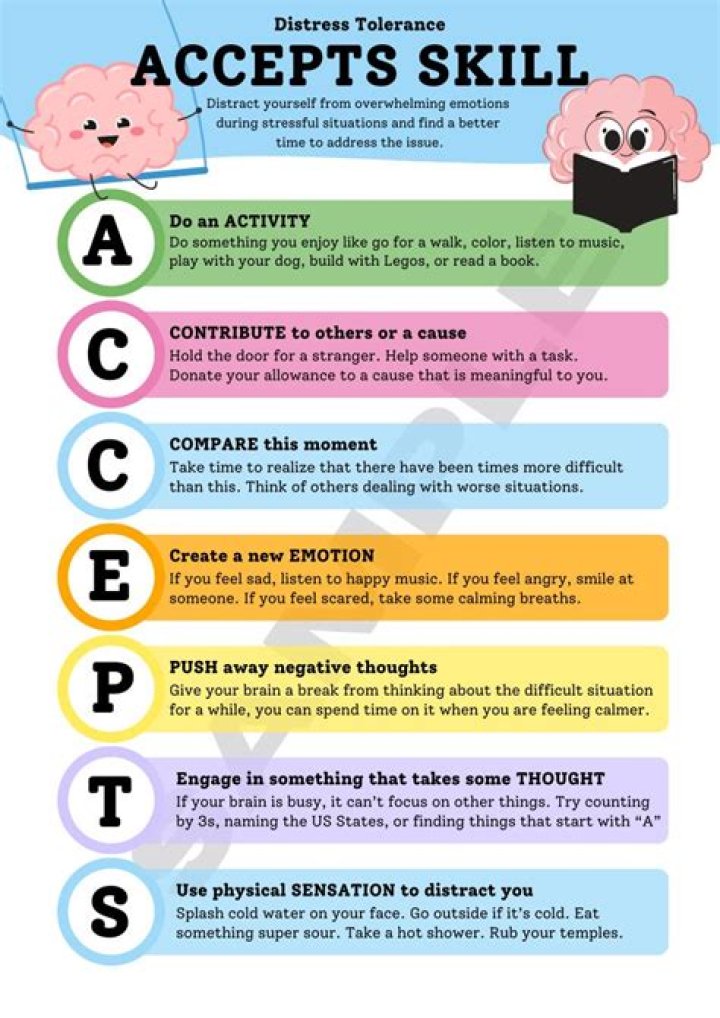 The DBT distress tolerance acronym ACCEPTS is a group of skills to help you tolerate a negative emotion until you are able to address and eventually resolve the situation. ... This DBT skill stands for Activities, Contributing, Comparisons, Emotions, Push away, Thoughts, and Sensation.