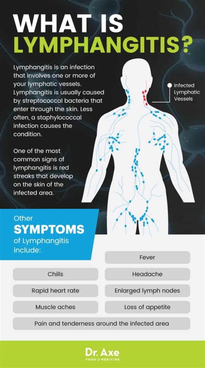 Common symptoms of lymphangitis include a fever, shaking chills, a rapid heart rate, and a headache. Sometimes these symptoms occur before the red streaks appear. The spread of the infection from the lymph system into the bloodstream (bacteremia.