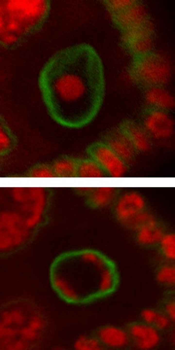 After staining with a DNA fluorescent dye (DAPI, Hoechst), karyosome appears as a spherical compact spot located in the center of the oocyte nucleus.