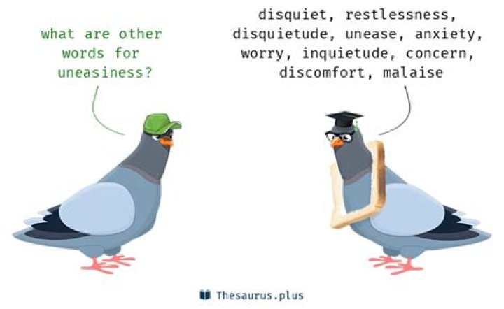 In this page you can discover 70 synonyms, antonyms, idiomatic expressions, and related words for uneasiness, like: unease, disquiet, malaise, agitation, turmoil, discomfort, assurance, anxiety, worry, tumult and embarrassment.