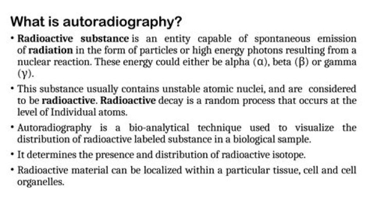 “Autoradiography is the bio-analytical technique used to visualize the distribution of radioactive labeled substance with radioisotope in a biological sample.” • It is a method by which a radioactive material can be localized within a particular tissue, cell, cell organelles or even biomolecules. •