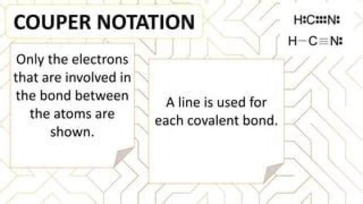 Another way of representing molecules is using Couper notation. In this case, only the electrons that are involved in the bond between the atoms are shown. ... Using Couper notation, a molecule of water and a molecule of HCN would be represented as shown in figures Figure and Figure below.