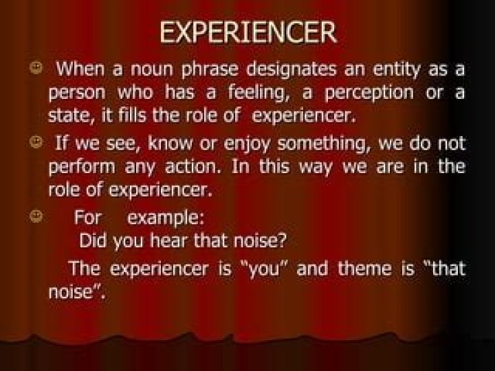 Agent – The entity that intentionally carries out the action of the verb. Experiencer – The entity that undergoes an emotion, a state of being, or a perception expressed by the verb.
